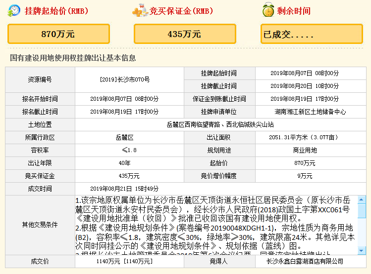 【喜報】湖南永鑫建設有限公司1140萬元拿下長沙市070號純商業用地